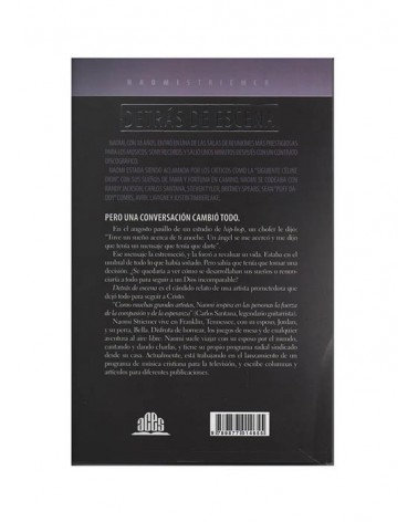 Naomi, a los 18 años, ingresó en uno de los sellos más prestigiosos de música (Sony Records) y salió pocos minutos más tarde con un contrato de grabación. Naomi fue aclamada por los críticos como la "próxima Celine Dion". Con sus sueños de fama y fortuna en progreso, Naomi se encontró a sí misma codeándose con grandes artistas. Pero una conversación lo cambió todo. En el estrecho pasillo de un estudio de hip-hop, un chofer le dijo: "Anoche tuve un sueño sobre ti. Un ángel se me acercó y me dijo que quería que te transmitiera un mensaje". El mensaje sacudió a Naomi hasta la médula y la obligó a reexaminar su vida. Estando en el umbral de todo lo que alguna vez había soñado, Naomi sabía que tenía una decisión que tomar. ¿Se quedaría para ver volverse realidad sus sueños o le daría la espalda a todo eso en busca de un Dios incomparable? DETRÁS DE ESCENA es la historia sincera de una artista prometedora que lo dejó todo para seguir a Cristo.